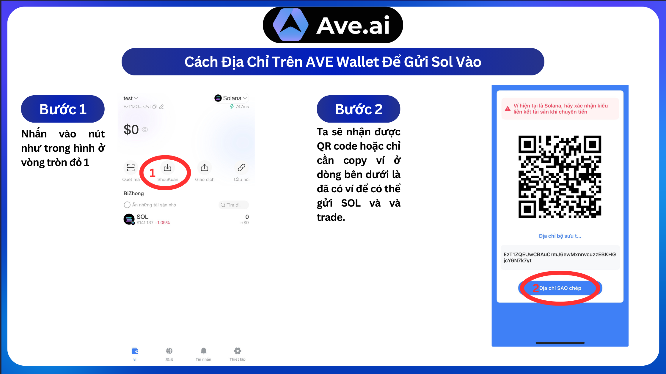 **Bước 2:** Nạp tối thiểu 50 USDT mạng lưới Solana vào Ave Wallet.
