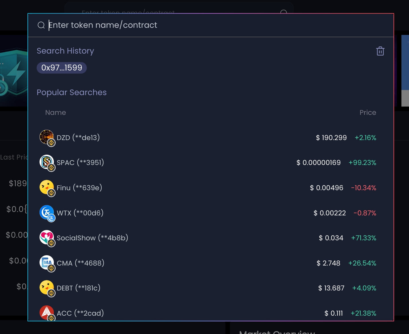 Tìm kiếm token muốn theo dõi ở thanh tìm kiếm bằng cách điền tên token hoặc dán địa chỉ contract của token.