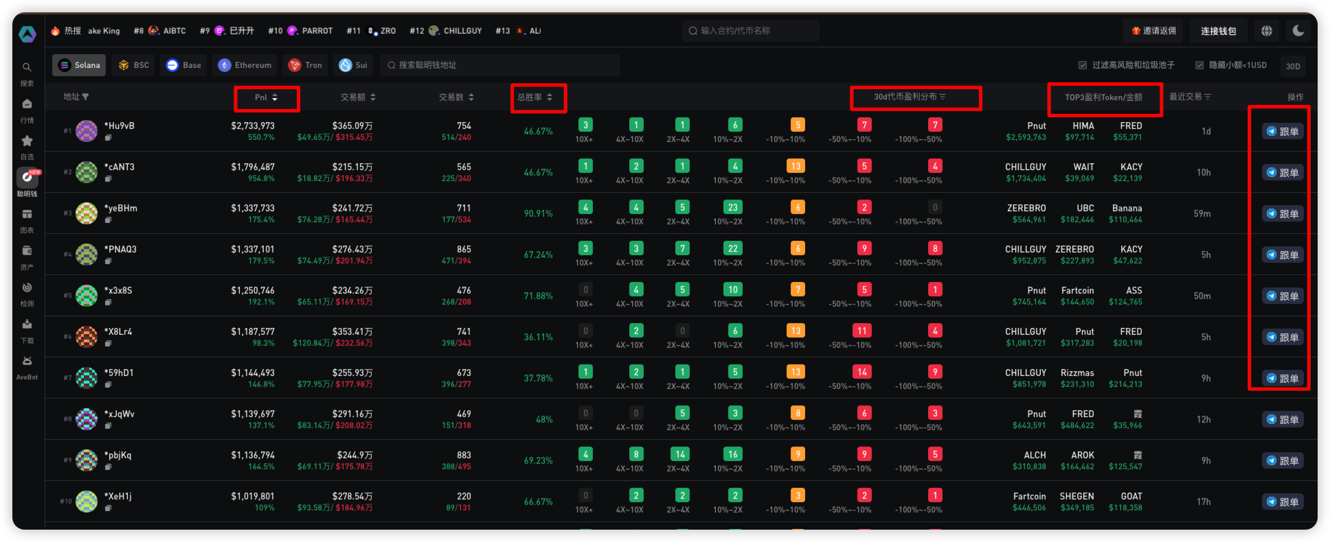 各条公链每天都有海量meme coin被创建，其中有一些成为金狗，也有一些迅速归零，如何从中找到具有潜力的金狗meme呢？一个取巧的方法就是追踪能在链上盈利的“聪明钱”。