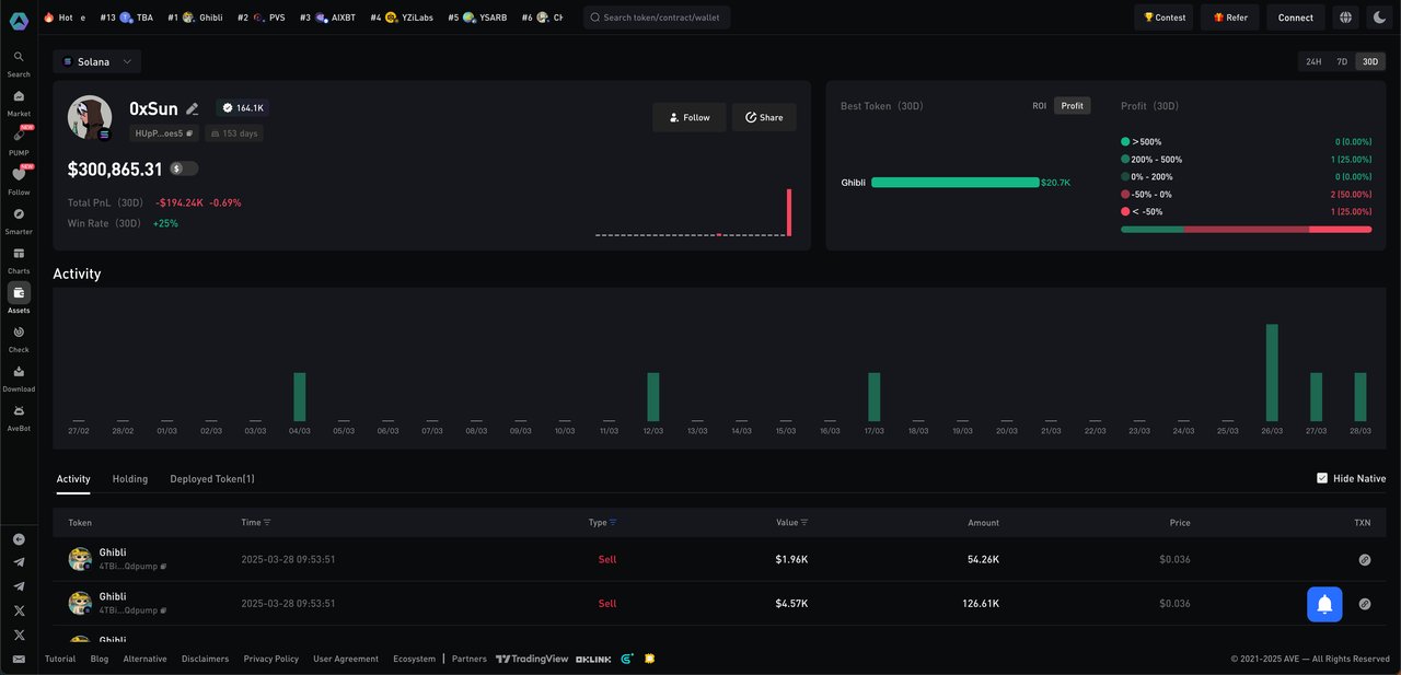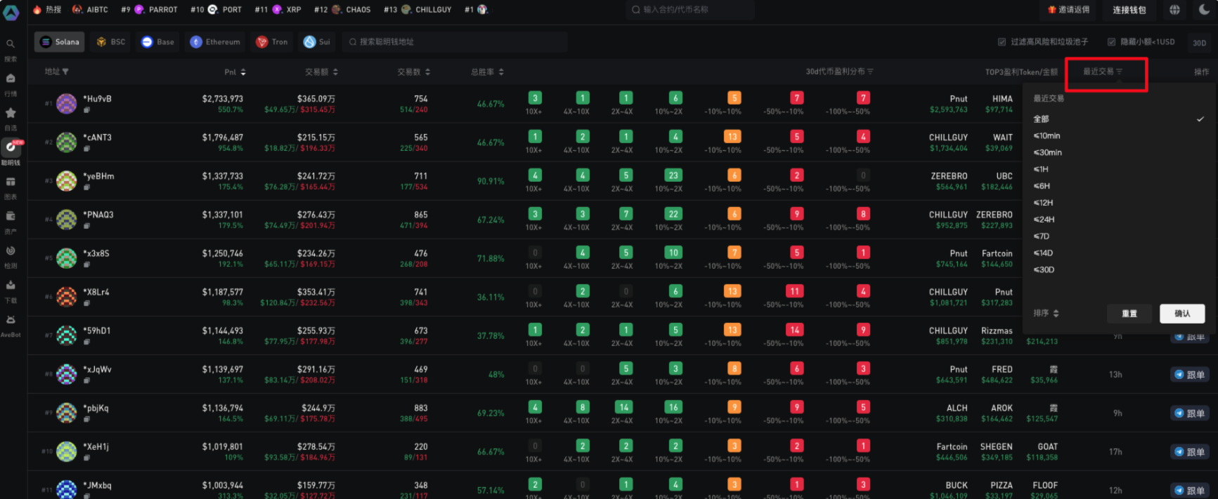 Ave.ai 通过链上大数据分析交易频率、盈利情况、胜率等数据，筛选出链上表现优质的聪明钱地址，并支持跟单功能。目前支持Solana、BSC、Base、Eth、Tron、Sui 等6条公链<br>