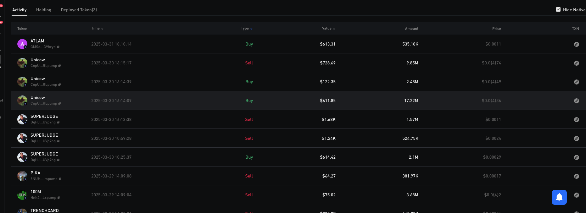 * 部署代币: 展示该地址部署过的pump代币, 以及代币是否发射, 最高市值等等