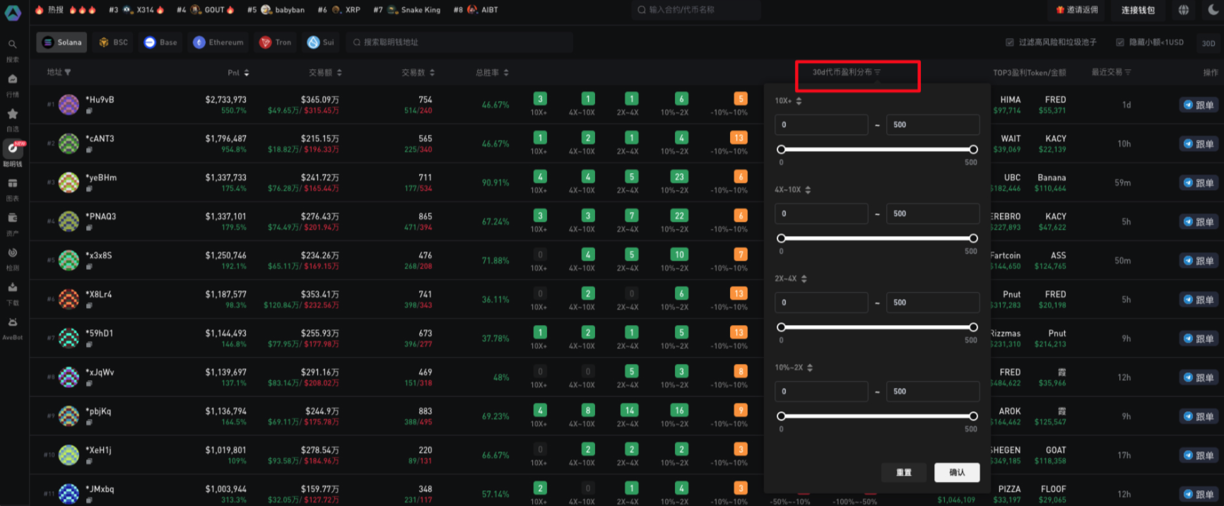 我们支持对聪明钱进行筛选，来挑选更优质的聪明钱。你可以筛选PnL在不同盈利区间的代币数量、或是最近一笔交易时间，来筛选出表现优异、交易活跃的地址