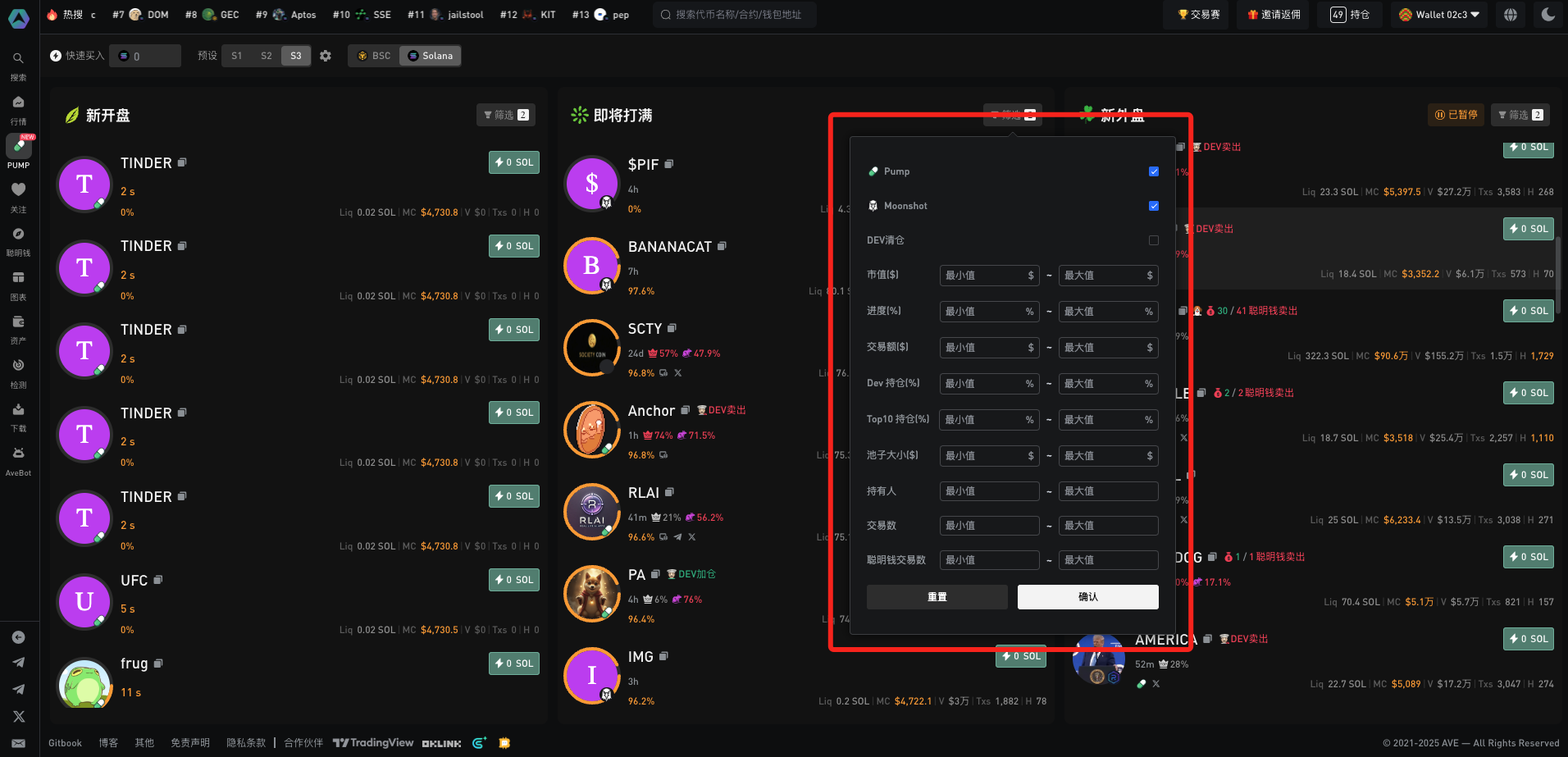 您可以根据您的交易策略，在各个发射阶段筛选代币并一键快速交易。&#x20;