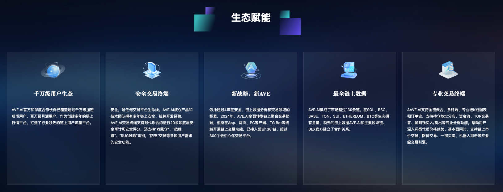 依托超过4年在安全、链上数据分析和交易领域的积累，2024年，AVE.AI全面转型链上聚合交易终端，相继在App、网页、PC客户端、TG Bot等终端开通链上交易功能，已接入超过130 条链、超过 300个去中心化交易平台。